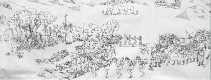 Escenas importantes de este mural muestran actividades económicas de diversa índole que tenían que ver con diferentes sitios del extenso territorio, magnitud que dio al mapa sus dimensiones de 1.50 por 1.50 metros. Como esta, que deja ver los intercambios que se daban con sociedades aborígenes ubicadas hacia el norte, como los muiscas de la Sabana de Bogotá, de los cuales se obtenían sal y mantas: