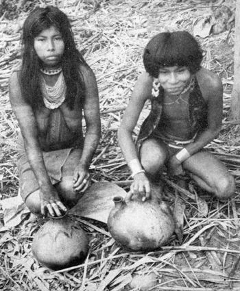 “Mientras que los hombres van así adornados y pasan largos ratos arreglando y brillando sus joyas de plata, peinándose o frotándose el cuerpo con hojas aromáticas, las mujeres llevan sólo pocos adornos, excepto la pintura con colores vegetales, un collar y algún brazalete de cuentas multicolores. Los bebés y los niños menores ya llevan un pequeño collar con algunas cuentas o semillas perforadas. Con ocasiones ceremoniales ambos sexos llevan flores en el cabello y los hombres se ponen a veces flores detrás de las orejas cuando van de visita o navegan por los ríos”. P. 90 a 92