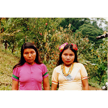 La mujer, muy joven, con collares de chaquiras y de cuentas metálicas y lanas amarradas en la cabeza. Al fondo flores blancas