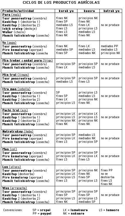 Para que se vea mejor la relación temporal entre los ciclos de los diferentes productos al tomar en cuenta el conjunto de nuestra agricultura, los hemos puesto lado a lado en un Gráfico Comparativo de los Ciclos de los Productos Agrícolas. La selección de los productos, los mismos del cuadro anterior, se hizo según su importancia tradicional, a pesar de que algunos, como la arracacha y la linaza, ya no se cultivan o sólo se producen en una escala muy pequeña, y a que no aparecen otros, como la oca y la mauja, que se producen pero están desapareciendo.