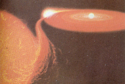 Fig. 43. La atmósfera estelar luminosa de una binaria de contacto fluye de la estrella gigante roja al disco de acreción de una estrella pulsar de neutrones (derecha). El disco brilla en rayos X y otras radiaciones en el punto de contacto. Pintura de Don Davis. (Carl Sagan: COSMOS, p. 235)