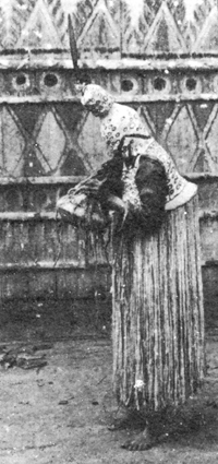 Solamente en las ocasiones fúnebres se baila con máscaras. Las mujeres se colocan para las danzas delantales de cuentas con figuras de grecas, semejantes a los de la cerámica y los tejidos. P. 150
