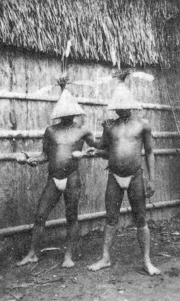 Fotografié a un indio uanana del Caiary (Vaupés) con vestido de danza: en la cabeza una banda de pequeñas plumas de tucán rojas y amarillas y por detrás una peineta larga y fina, cuyas puntas largas tenían infinidad de pequeñas plumas multicolores. Del centro de la peineta caía una larga cola de plumas blancas de garza casi hasta los talones. P. 55-56
